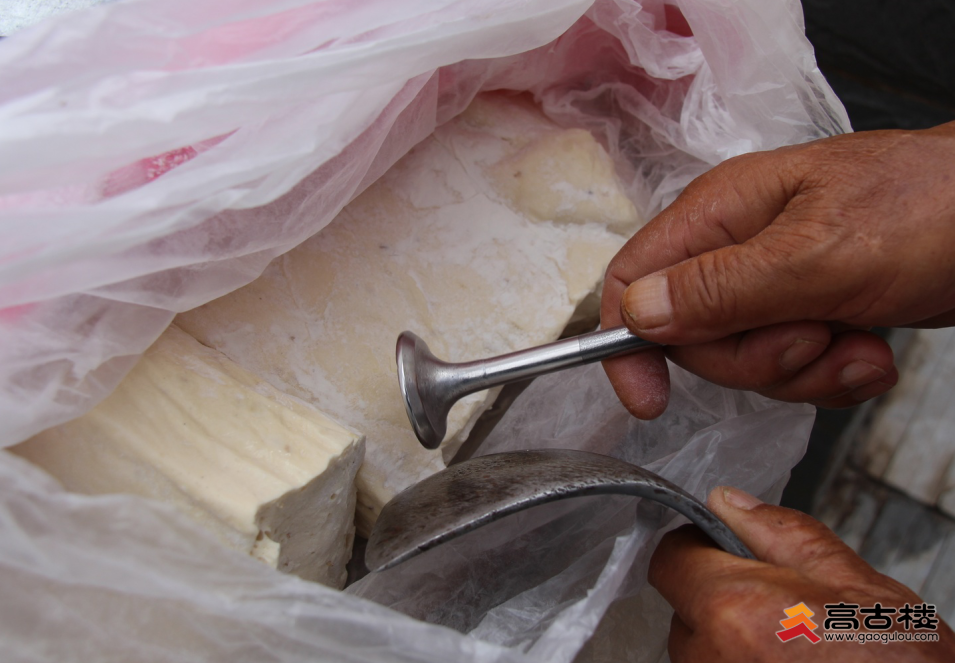 把米交给卖糖人,他会拿出一杆小小的秤称一下,然后将糖刀嵌入糖块后,用小钉锤轻轻敲击,只听见清脆的“叮叮”几声后,几小块叮叮糖就被敲落下来。