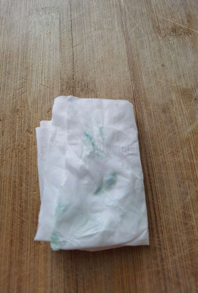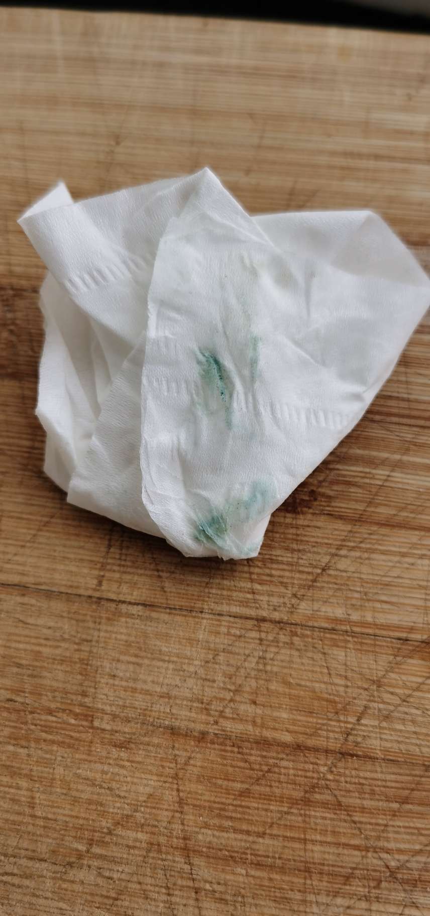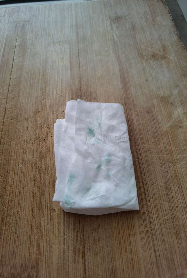 今天老人菜市场买了点蒜苗回来,我用餐巾纸轻轻擦了哈蒜苗叶子,餐巾纸上染色 了 ,如图。之前听说过用纸擦蒜苗叶子会有染色情况,今天尝试了一下,还真如此,楼友们在评论区说说这个蒜苗是否可以吃?吃了是否安全?