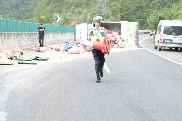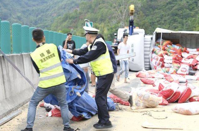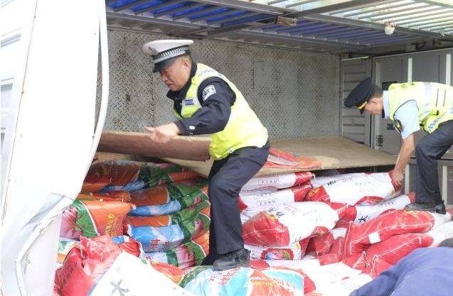交警首先联合现场其他部门人员,将散落饲料搬移至路边,尽可能保证现场能有一个车道通行。施救车辆赶到现场后,民警组织现场救援人员对散落的5吨饲料进行搬运和清理,并对侧翻车辆进行起吊和拖离,现场很快恢复正常通行。
