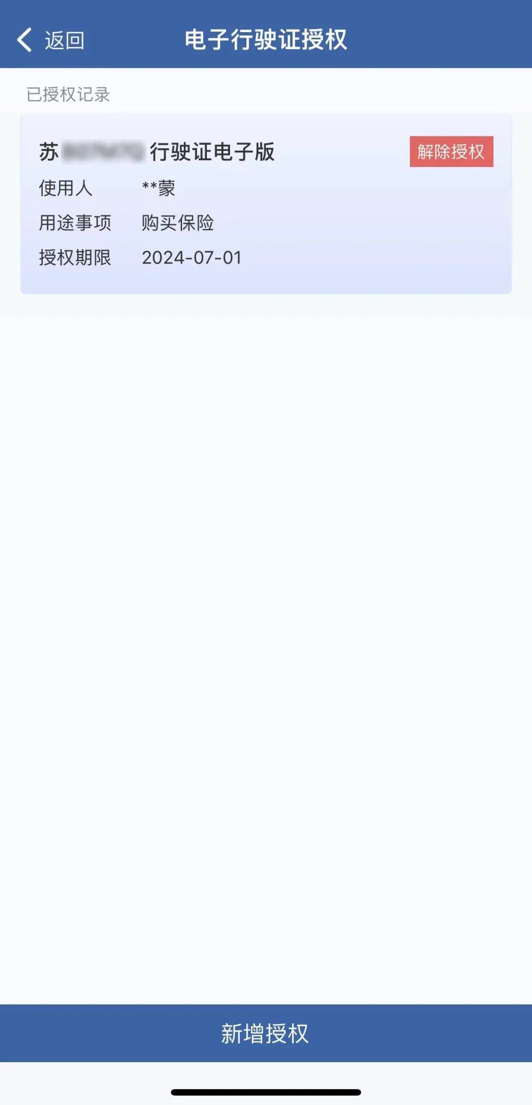 需要使用非本人或单位车辆电子行驶证的,需经机动车所有人或单位法人、车辆管理人员授权方可出示。点击电子行驶证下方【授权】按钮进入授权列表,点击页面下方【新增授权】,填写被授权人身份证号、姓名和授权有效期,选择用途事项,提交授权。提交后被授权人电子证件列表中将增加授权电子行驶证列表项,用户可点击显示授权出示的电子行驶证。授权有效期最长为7个工作日。机动车所有人或单位法人、车辆管理人员可在授权列表中点击【解除授权】按钮中途解除授权,解除授权或授权到期后电子行驶证自动作废,被授权人“交管12123”APP不再显示。![]()