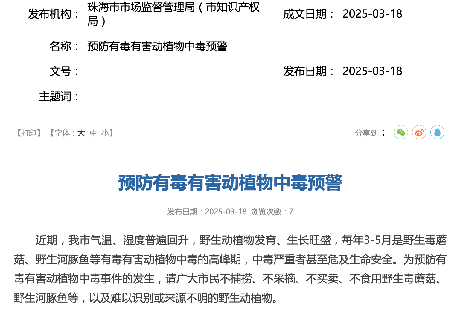 直接接触蟾蜍也可能导致皮肤出现红肿、红疹、瘙痒等症状,还有可能引起荨麻疹、接触性皮炎等过敏性皮肤病。如果毒液进入眼睛,还会引起视力下降、眼部红肿、瘙痒等症状,严重时可导致失明。蟾蜍毒素性质稳定,普通厨房加工手段无法破坏其毒性,用120℃的水将蟾蜍煮沸加热,4小时后仍能检出毒性成分。至于将之泡酒可消除毒性并无科学根据,酒精反而会加速毒素溶解,近年已有多起饮用蟾蜍酒致死案例。仅食用腿部肌肉也无法避免危险,因为毒素可通过蟾蜍的淋巴循环渗透至全身组织。近日,珠海市市场监督管理局发布预警,提醒广大市民预防有毒有害动植物中毒。详情如下:近期,珠海市气温、湿度普遍回升,野生动植物发育、生长旺盛,每年3-5月是野生毒蘑菇、野生河豚鱼等有毒有害动植物中毒的高峰期,中毒严重者甚至危及生命安全。为预防有毒有害动植物中毒事件的发生,请广大市民不捕捞、不采摘、不买卖、不食用野生毒蘑菇、野生河豚鱼等,以及难以识别或来源不明的野生动植物。3~5月,河豚鱼皮下脂肪含量最高,肉质鲜美,但也是河豚鱼毒性最强时节。河豚鱼的毒性是由其体内的河鲀毒素引起的,0.5毫克就能致死,中毒过程急速而剧烈,尚无特效解毒药。河鲀毒素耐酸、耐高温,需220℃以上方可分解,一般烹调手段包括盐腌、日晒等都难以破坏;经过专业处理的河豚也并非没有毒性,过量食用依然会对身体造成伤害。唯一有效的预防方法就是不捕捞、不销售、不购买、不加工、不食用野生河豚鱼,未经审批的企业不得加工河豚整鱼,餐饮单位不得为消费者提供野生河豚鱼加工制作服务。蟾蜍是两栖动物,俗称癞蛤蟆。蟾蜍的毒性物质,不单存在于耳下腺和皮肤腺,还存在于肌肉、肝脏和卵巢。为防止中毒,市民切勿随意食用蟾蜍,购买食用蛙类时要辨清蟾蜍,慎防中毒。餐饮单位禁止加工制作蟾蜍。目前对蟾蜍中毒尚无特效疗法。一旦发生误食蟾蜍中毒,应立即采用催吐、洗胃、导泻、灌肠等方法,迅速排除毒素。皮肤染毒也要迅速用温开水冲洗,并尽快送医院处理。织纹螺,俗称海丝螺、海狮螺、麦螺或白螺等,其外形特征表现为尾部较尖,细长,长度约1厘米、宽度约0.5厘米,约指甲盖大小。引起织纹螺中毒的主要原因是河豚毒素和麻痹性贝类毒素,食用后可产生头晕、呕吐、口唇及手指麻木等中毒症状,潜伏期最短为5分钟,最长为4个小时。对食用织纹螺引起的中毒,目前尚无特效治疗解毒药物。毒蘑菇种类繁多,毒性成分复杂,中毒表现各异,主要有恶心、呕吐、流涎、流泪、精神错乱、急性贫血、黄疸、脏器损害等;中毒后,病情凶险,病死率高,且没有特效疗法,严重者可导致死亡。毒蘑菇中毒事件主要由家庭误采、误食导致。关于毒蘑菇:- 一是鉴别野生蘑菇是否有毒,需要专业机构和人员,目前没有简单、易行、可靠的鉴别方法。民间、网络流传的一些识别方法经证明并不可靠,不要轻易相信网络和一些非专业机构宣传资料上鉴别有毒野生蘑菇的方法。