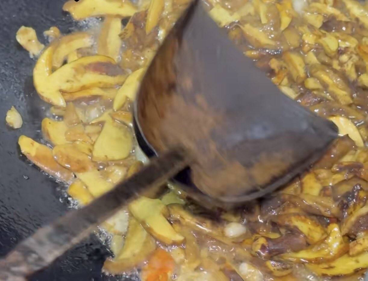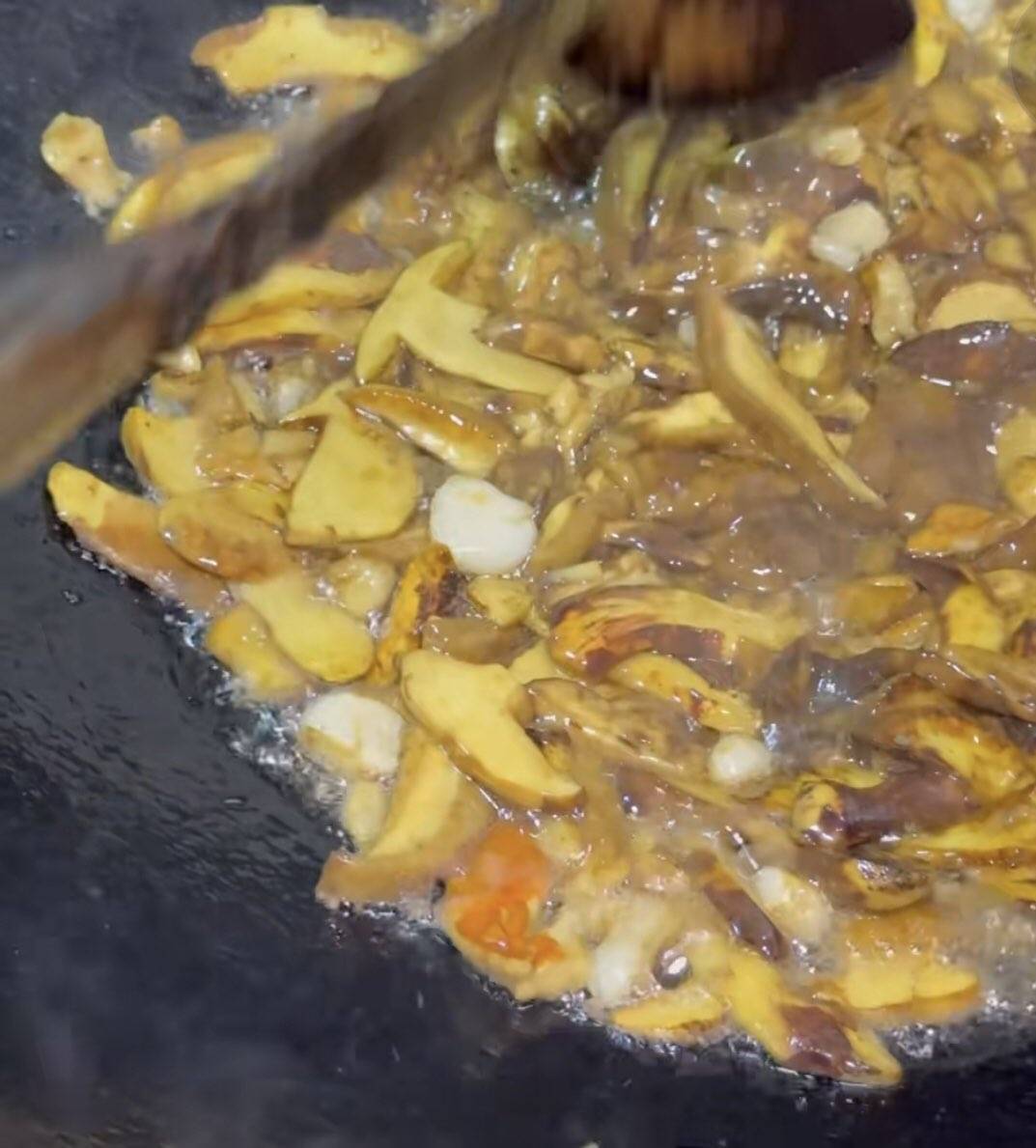 炒菌多放点油,菜籽油猪油都来一点,炒出香味下辣椒大蒜,新鲜花椒粒,再炒会,放水没过菌,把水煮干,注意铲铲上别沾着菌
