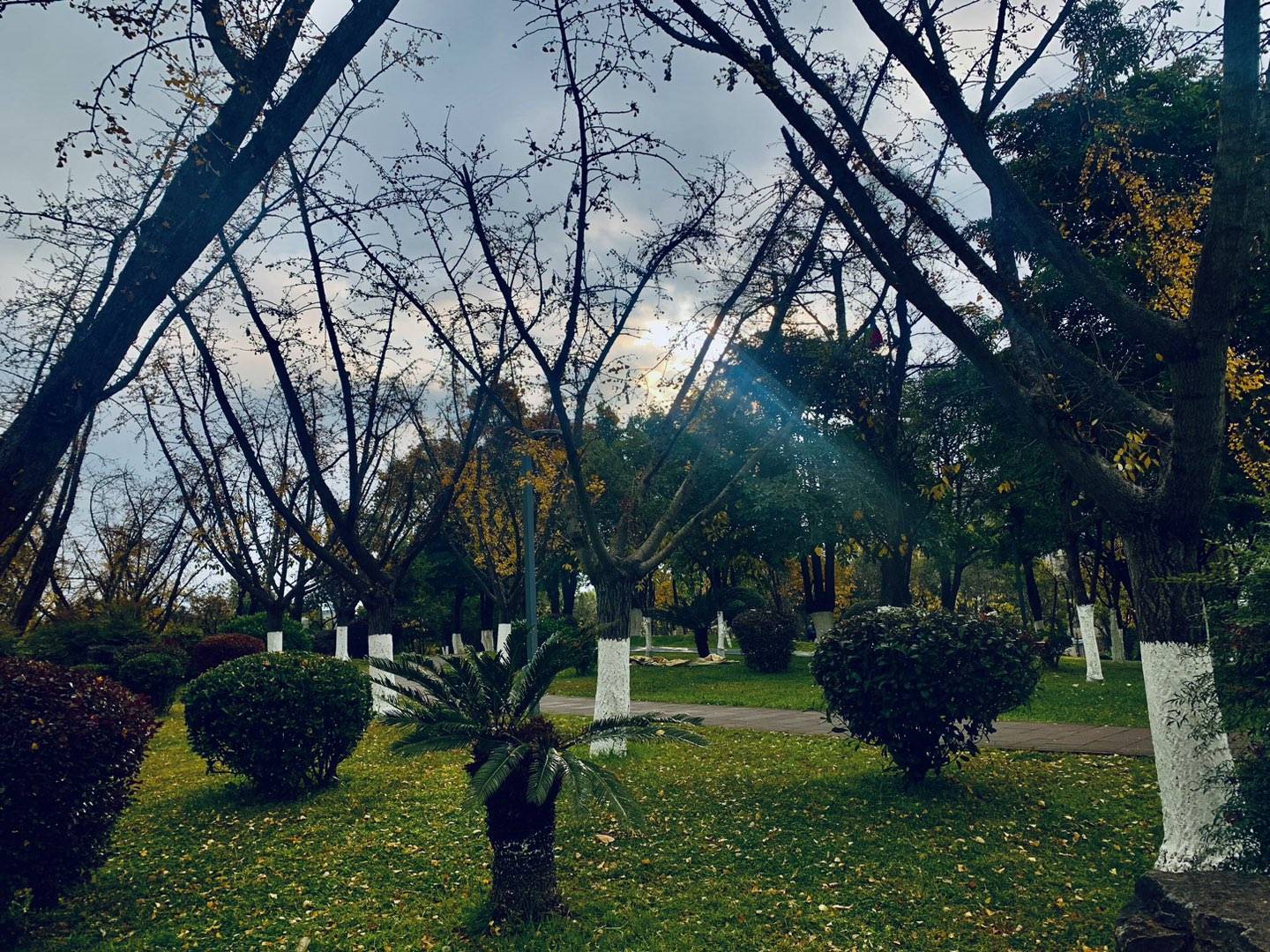 初冬的早晨,薄雾弥漫,阳光穿过树叶,显得格外温柔,让人感到一种静谧的美。