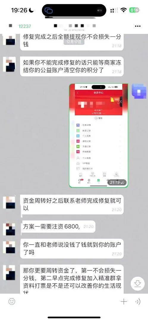 第四步实施诈骗:以“任务操作错误需充值修复”为由索要钱财,完成诈骗闭环。