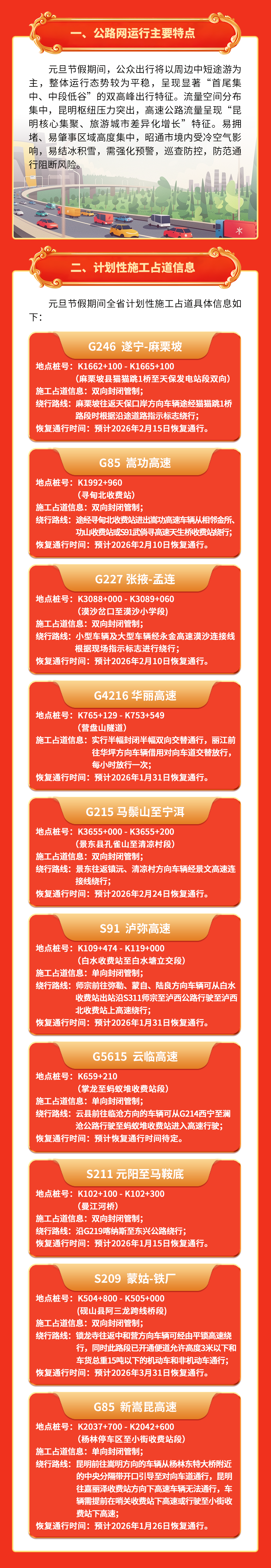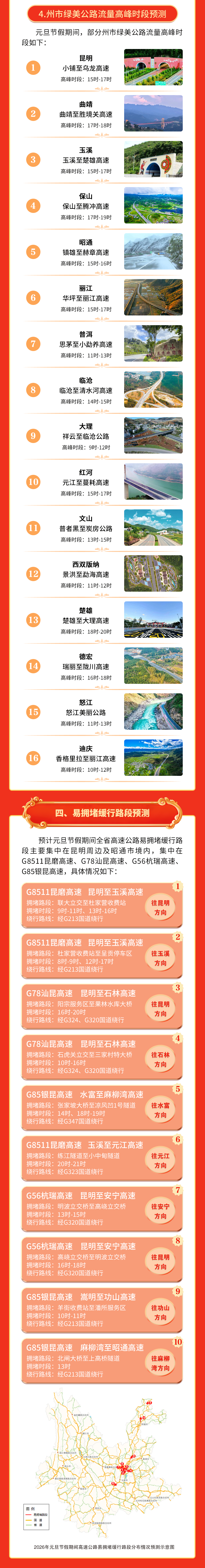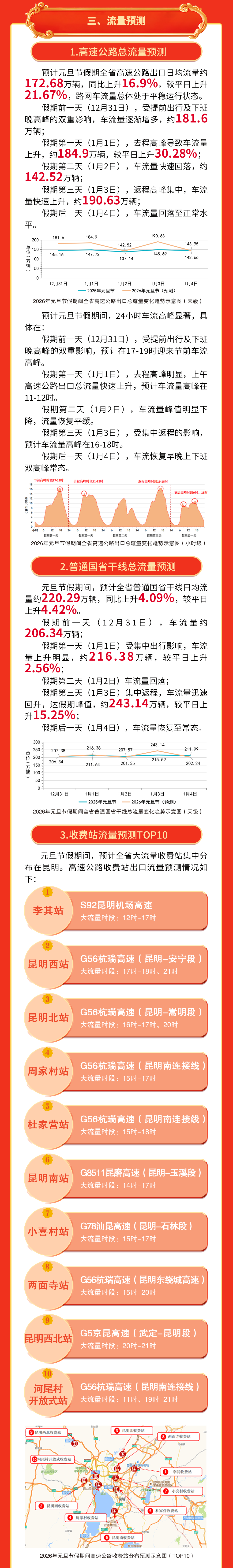 就在下周! 元旦小长假要来了 2026年元旦节假期 1月1日(周四)至3日(周六) 放假调休,共3天 1月4日(周日)上班 根据国务院发布的《关于批转交通运输部等部门重大节假日免收小型客车通行费实施方案的通知》(国发〔2012〕37号),收费公路免费通行的时间范围为春节、清明节、劳动节、国庆节等四个国家法定节假日。 日前 云南省综合交通发展中心发布 《2026年元旦节假期云南省公路网出行服务指南》 详情如下 大家假期都有什么计划 欢迎留言分享~