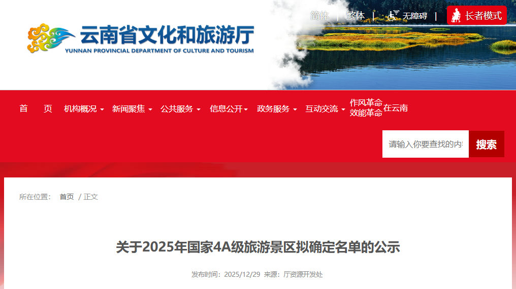 根据《旅游景区质量等级划分》(GB/T 17775-2024)国家标准和《旅游景区质量等级管理办法》要求,经各州(市)文化和旅游局初评、推荐,省文化和旅游厅按程序组织开展了2025年国家4A级旅游景区评定工作,寻甸柯渡红军长征纪念馆景区等16家景区达到国家4A级旅游景区标准,拟确定为国家4A级旅游景区。