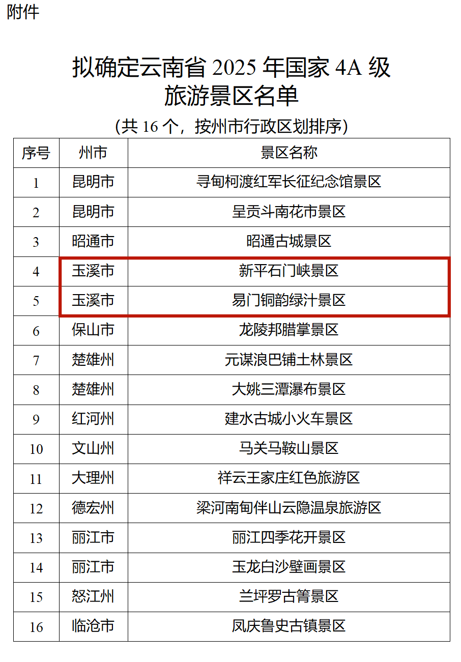 附件:拟确定云南省2025年国家4A级旅游景区名单