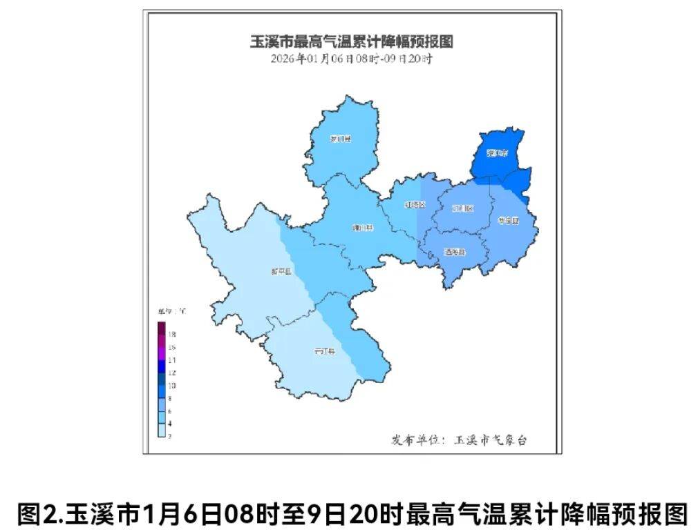 受冷空气影响,预计1月6日至9日,红塔区将出现强降温弱降雨天气过程,最高气温累计下降6~8℃,局地下降超过10℃;过程期间,全区将出现持续低温阴冷天气,需提前采取防寒措施。