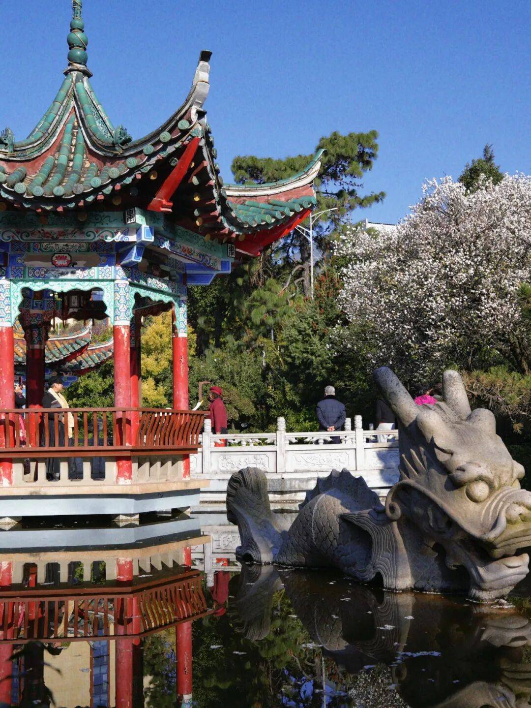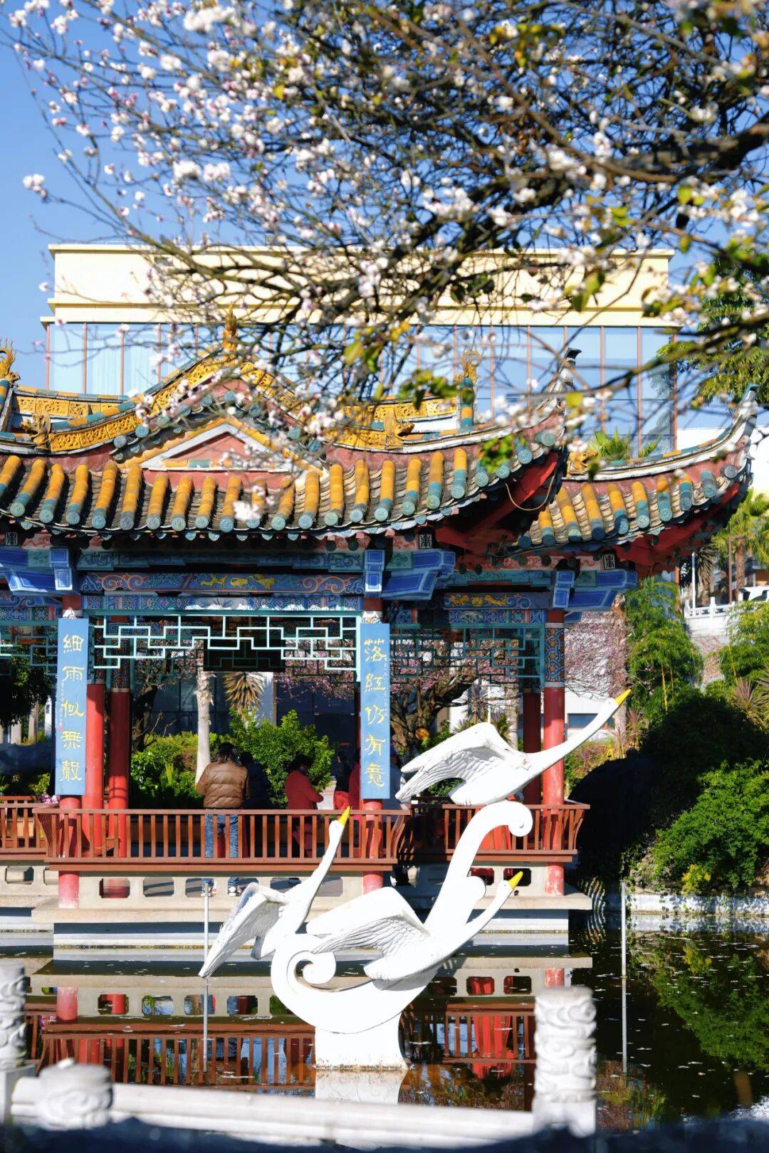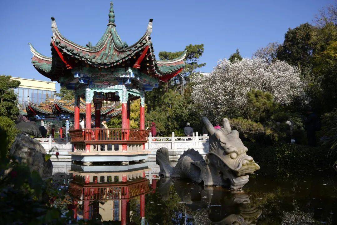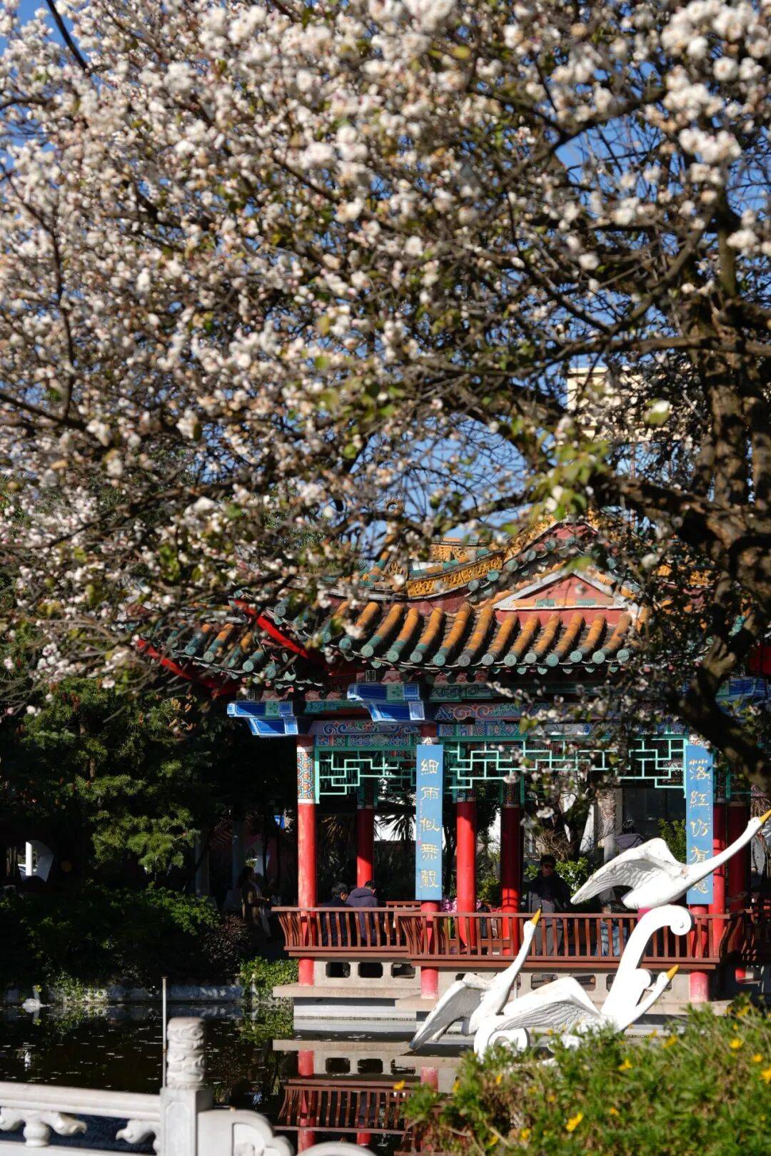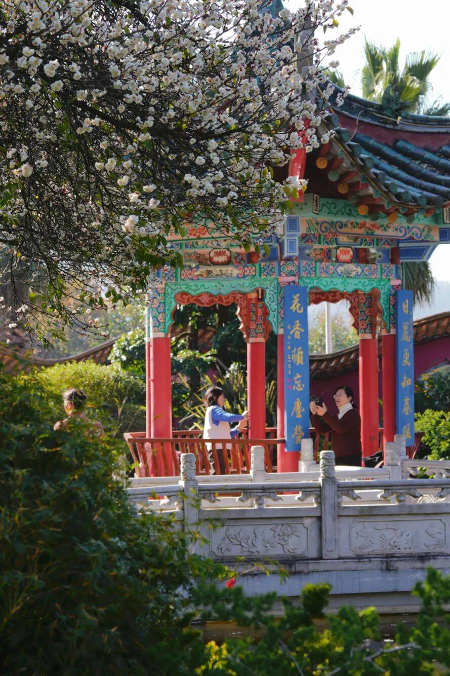 在玉溪红塔区的城市肌理中 藏着一处自带江南韵味的秘境 玉溪玉苑 这里没有喧嚣的人潮 只有满园春色与红墙绿瓦相映成趣 如今梅花悄然绽放 更是将这份古典雅致推向了极致 成为本地人私藏的打卡地 也是摄影爱好者不容错过的取景地 刚踏入玉苑,那座挂着 “玉苑” 匾额的中式门楼便撞入眼帘 —— 青灰瓦檐配着朱红立柱,门楣两侧的蓝底楹联衬着镂空花窗,连石狮子都透着江南园林的雅致,像极了古画里的宅院入口。 飞檐翘角的亭子立在水畔,青瓦红柱裹着彩绘雕梁,阳光一照,连檐角的纹路都泛着暖意;近岸处,石龙探首浸在波光里,鳞甲上沾着几瓣白梅,身后的梅林堆雪似的铺展开,风过时落瓣飘在水面,连倒影都裹着细碎的花影——这一幕,把江南园林的雅致与灵韵,揉得恰到好处。 转过廊角,一眼便撞进这方 “框景” 里:红墙衬着瓦当的暖棕,扇形花窗把苍劲盆景、远山淡影都框成了画,连石峰的纹理都浸着阳光的暖意,抬手一拍,便是江南园林里 “以小见大” 的雅致。 园内的植被远比想象中丰富:老梅树的苍劲、天堂鸟的舒展、修剪成云纹的松柏、挂着小果的冬青…… 连石阶旁的青苔都裹着湿润的绿意,走几步就能撞见不同的植物惊喜。 而此刻最动人的,是枝桠间攒着的白梅——簇簇繁花挤在黛色瓦檐旁,花瓣薄得像宣纸,风过时落英轻飘,落在石径的青苔上,连空气里都裹着清冽的香。 早晨的暖阳格外慷慨,温柔地洒在花瓣上,晕开层层柔光。阳光穿透花枝,在地面投下疏疏落落的影子,与亭台相映成趣。 没有枯叶的萧瑟,唯有繁花朵朵挤着挨着,粉的娇嫩、白的莹润,一簇簇、一枝枝。微风轻拂,梅枝便在光影里轻轻摇曳,那缕沁人心脾的暗香也随之浮动,不浓不烈,却清冽持久,悄悄勾着游人的脚步往里探寻。 园子里的小湖更是点睛之笔:飞檐翘角的亭子立在水边,琉璃瓦顶的倒影落在澄澈湖面,连石雕都似要从水中振翅而起,风一吹,波纹晃着亭台树影,恍惚间真以为踏进了苏杭的园林里。 两座亭子隔湖相对,像一对 “江南知音”。近岸亭上题着 “日丽更知春暖,花香顿忘尘劳”,阳光落在朱红立柱上,读着联语便觉满身松弛;对岸亭的联语带着朦胧美:“落红仍有意,细雨似无声”,风过时檐角铜铃轻响,连字里的温柔都跟着漫开。 湖面是玉苑藏得最深的 “诗意彩蛋”——近岸处,一尊石龙头探出水面,鳞甲纹理浸着水光,白梅落瓣飘在它鼻尖,像是给这方 “灵物” 缀了春妆。 对岸的鹅造景更添轻盈,白羽雕塑展着翼尖立在波心,身后的白梅林成了天然背景,风过时,花瓣落在肩头,连倒影都裹着细碎的花影。 两种造景一刚一柔,衬着满池的梅瓣与涟漪,像把 “春临灵境” 的画卷铺在了眼前。 园子里的热闹,是藏在花影里的温柔烟火:石径边的蓝板凳上,裹着厚外套的小朋友们支着画板,把满树白梅的疏影,一笔一笔描进画纸里; 石桥栏杆旁,姑娘举着手机,镜头追着枝桠间的繁花,连发丝都沾着阳光的温度; 芭蕉叶掩映的小径旁,老先生倚着假山,把亭台的飞檐与梅香,都收进了相机的取景框里。 不同的身影,在同一片梅林与古建间穿梭,把冬日的清寂,揉成了鲜活的人间暖意。 此时的梅花,既有 “凌寒独自开” 的傲骨清姿,又因游人的欢声笑语多了几分温婉灵动,那份冰清玉洁与人间温情的碰撞,让玉苑公园成了冬日里最动人的打卡地。 玉溪玉苑位于红塔山附近,可导航“玉苑”前往,建议自驾或骑行,周边交通便利,停车方便。 周边可串联红塔山景区,漫步红塔山后再打卡玉苑,解锁一站式游玩体验。 园区对外开放,无需门票,适合亲子游、情侣约会、闺蜜打卡及摄影创作。 园内植被丰富,建议穿着浅色系或古风服饰,与红墙绿瓦、梅花搭配,出片效果更佳。 游玩时注意爱护花草树木,不要攀折梅花、踩踏植被,共同守护这份美景。 这个一月 不妨逃离城市的喧嚣 走进玉苑 在红墙绿瓦间邂逅梅花的芬芳 感受藏在红塔区的江南韵味 让这份雅致与美好 成为专属你的难忘回忆