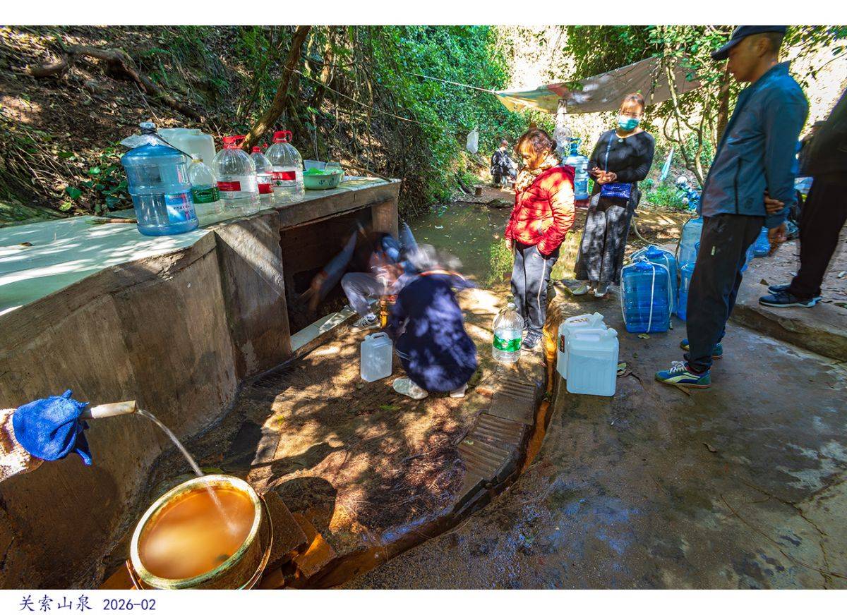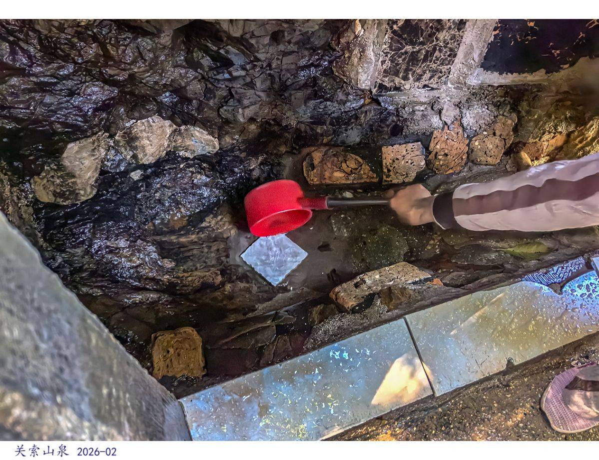关索山泉:位于关索庙东侧山沟里的半山腰处,来这里打水的人不少。该处有两股水,打的是沿山石渗出的,引流出的矿物质含量大,看着水清透,流过之处锈色、絮状沉淀多。![]()