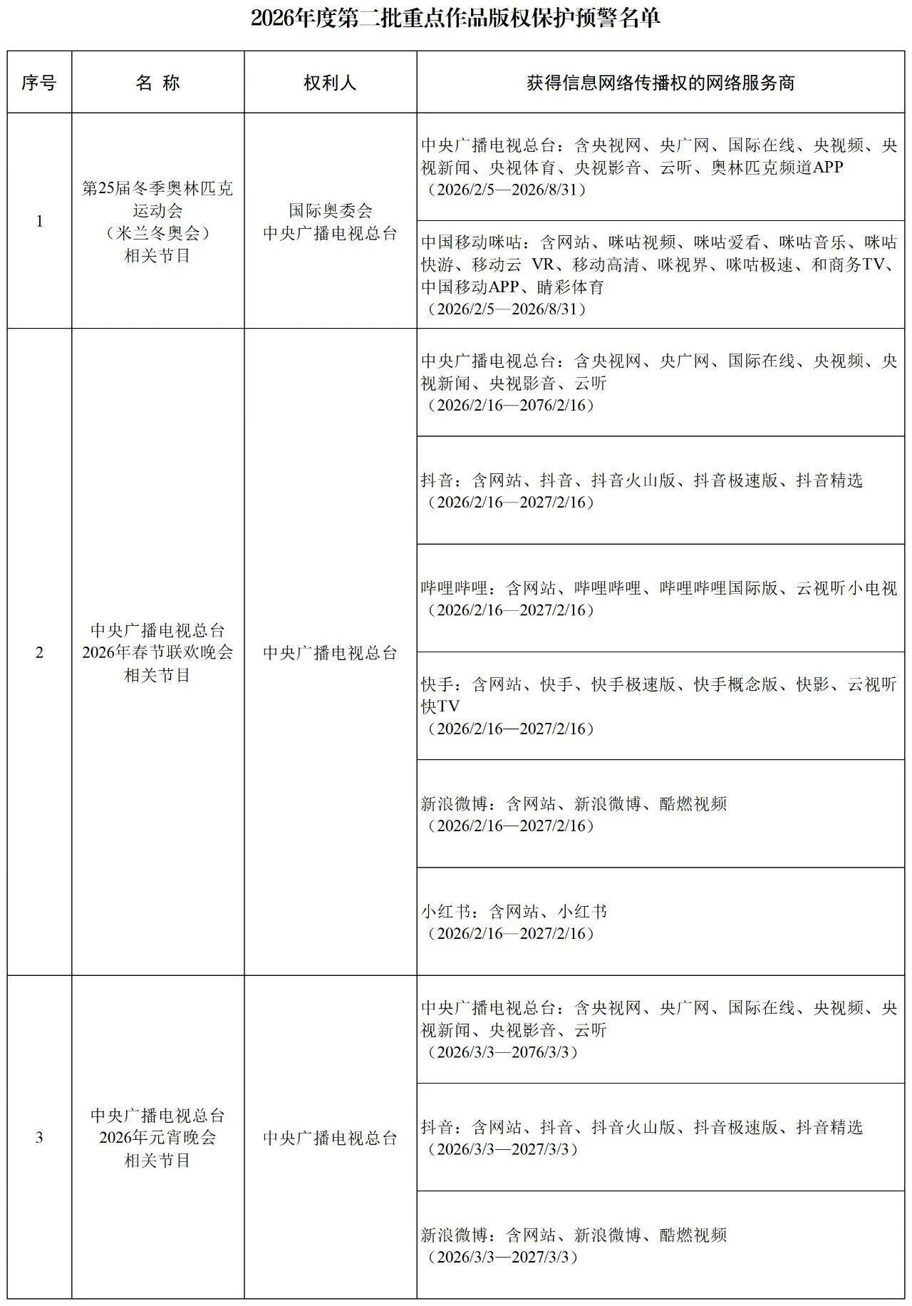按照国家版权局《关于进一步加强互联网传播作品版权监管工作的意见》及版权重点监管工作计划,根据相关权利人上报的作品授权情况,现公布2026年度第二批重点作品版权保护预警名单。