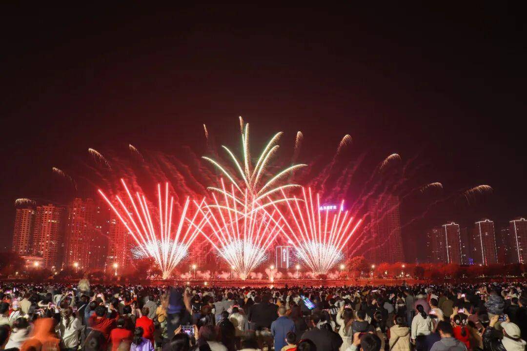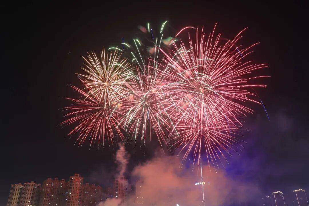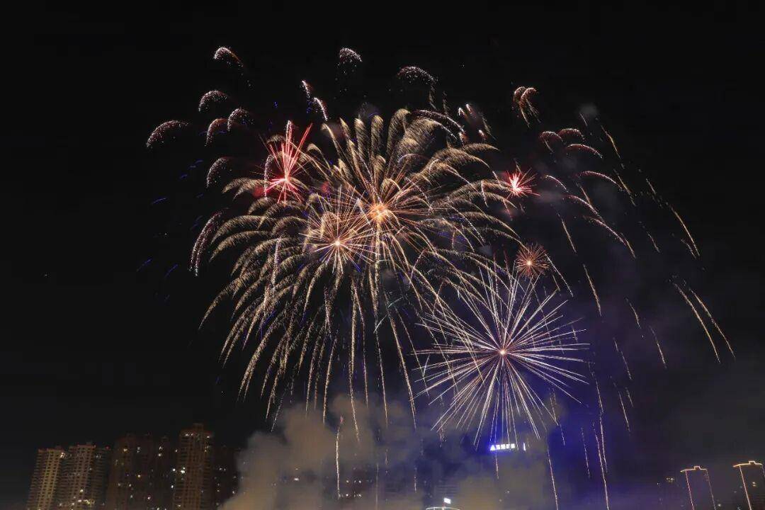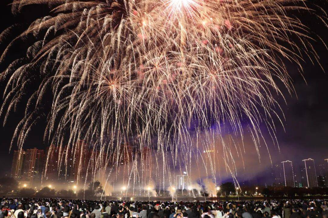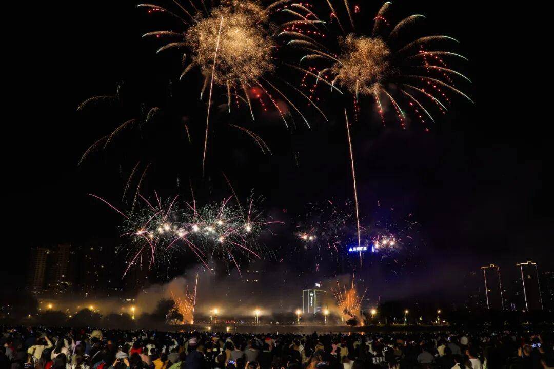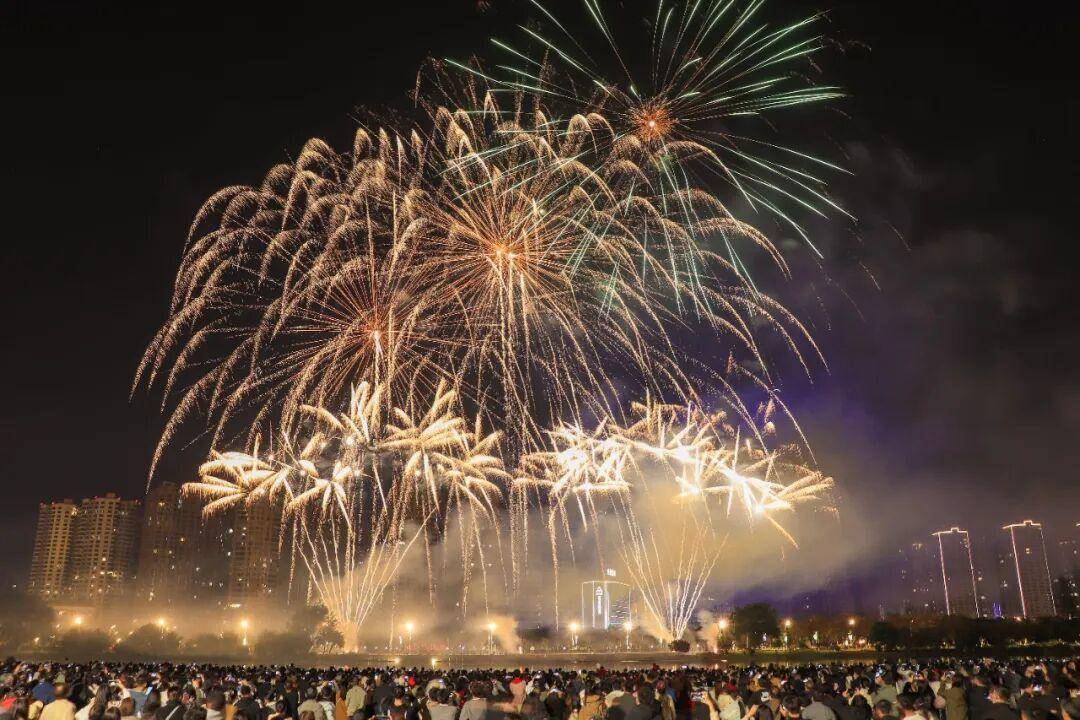 烟花划破夜空的刹那,金芒四射、彩雾弥漫,既有温柔倾泻的“星河瀑布”,也有热烈绽放的“繁花似锦”,与城市灯火交相辉映,将新春的氛围感拉满到极致。