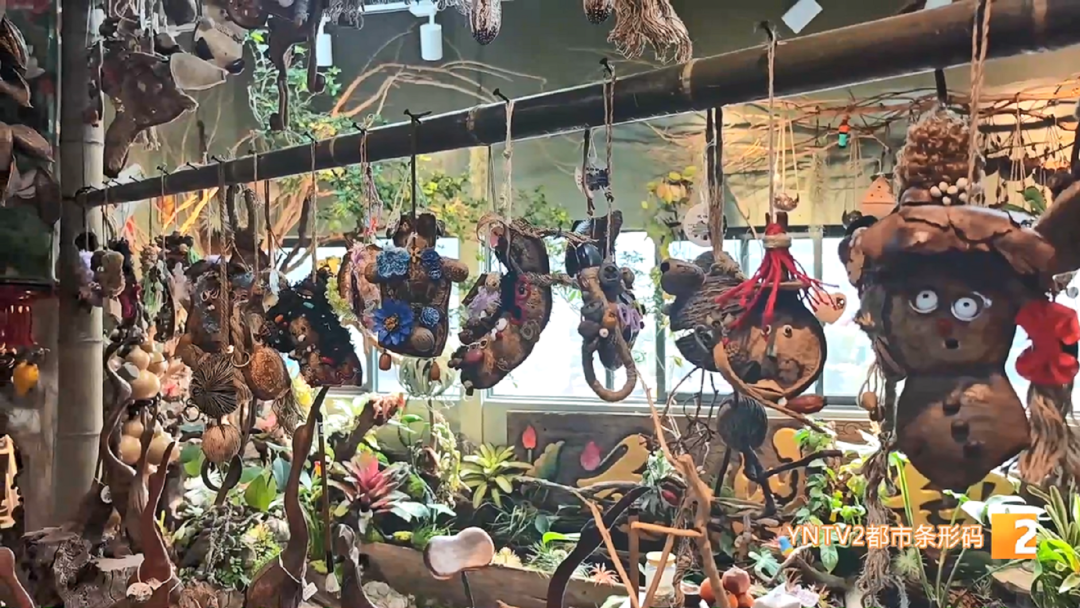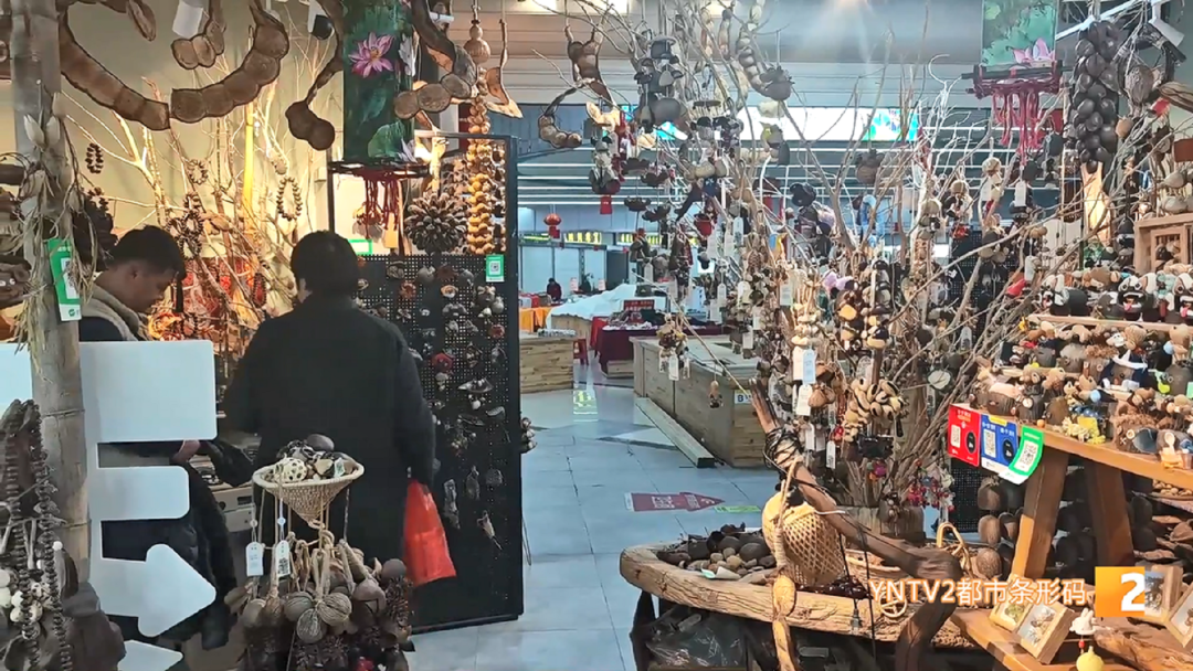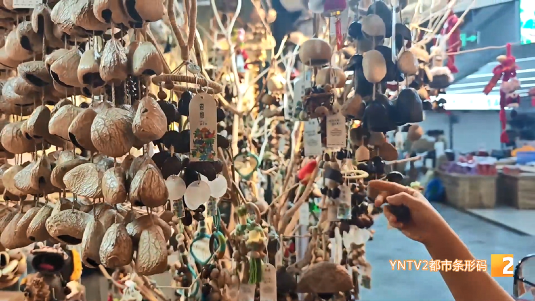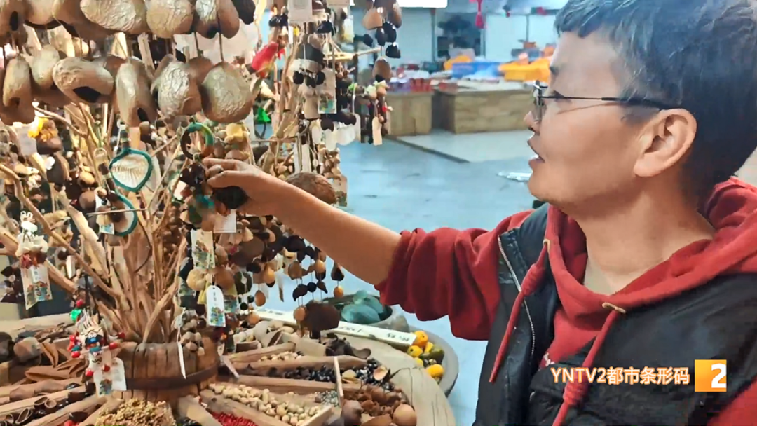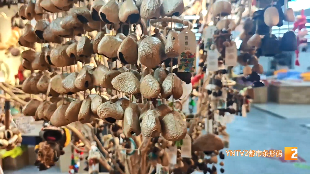 云愈工艺品店 郑翠萍:“种子这一两年特别火,有的就直接做成标本,用个小筐装着;有的还在上面做小工艺品,和其他种子一起配成各种各样的小风铃,把里面的果仁取了后,配成各种各样的风铃,它能发出优美的声音,可以解压。”