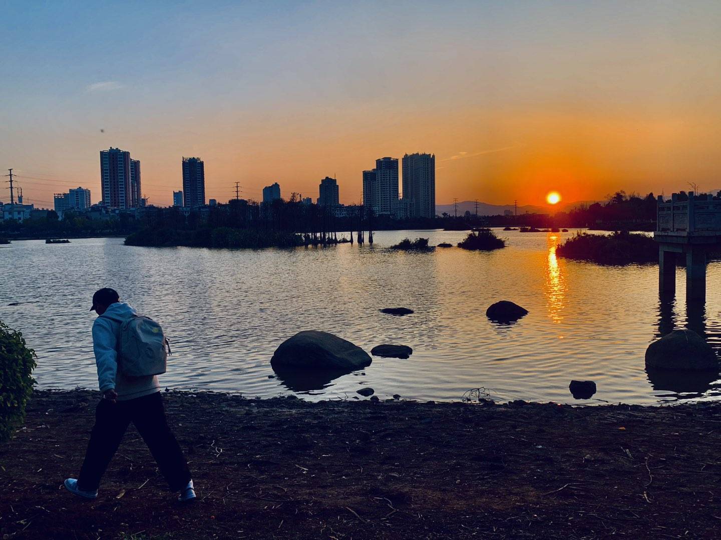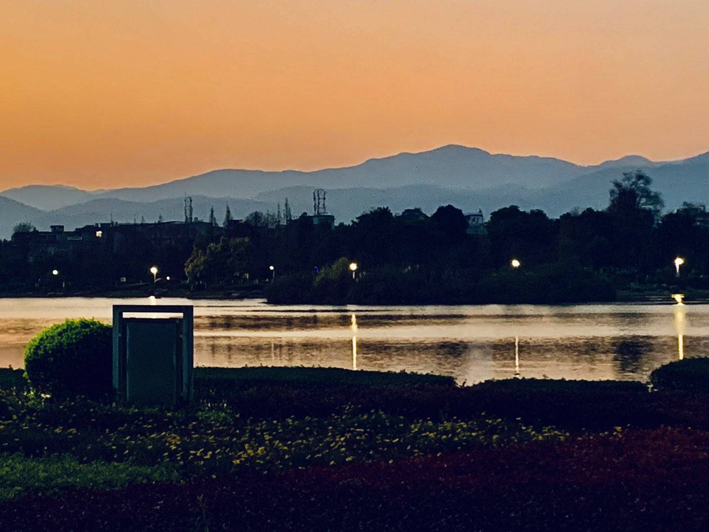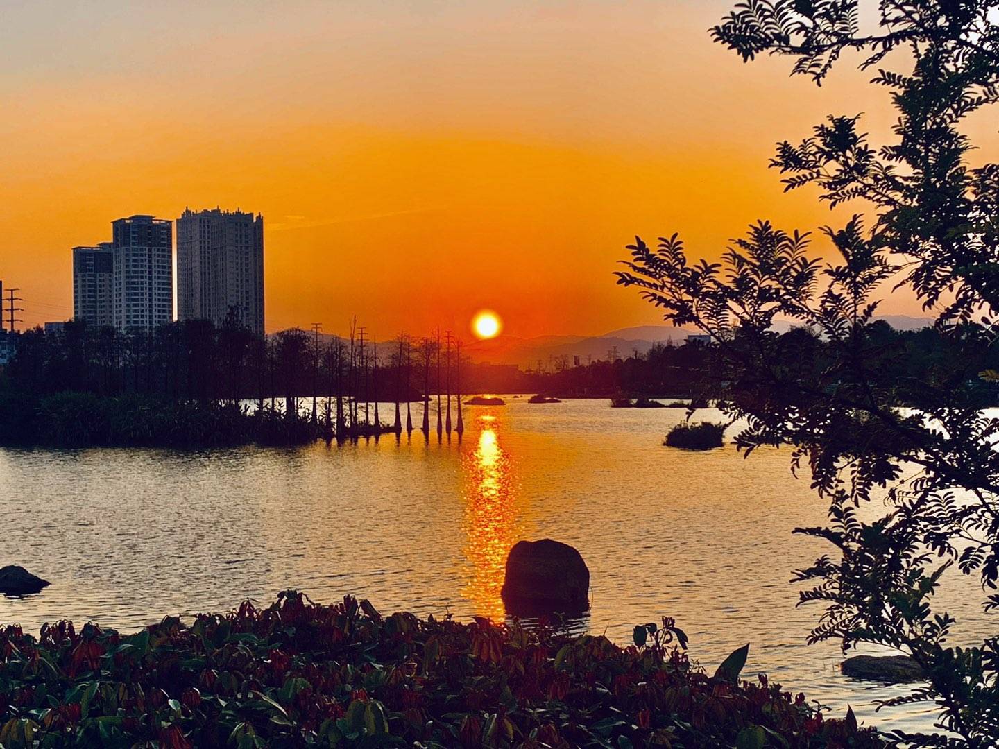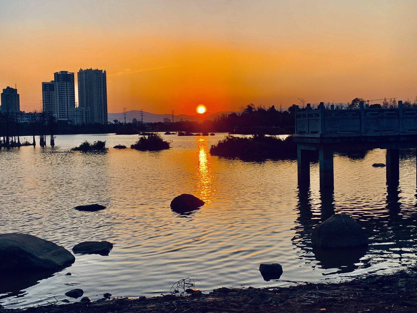 黄昏时分,夕阳的余晖把湖面映照得金光闪闪,绚丽多彩!