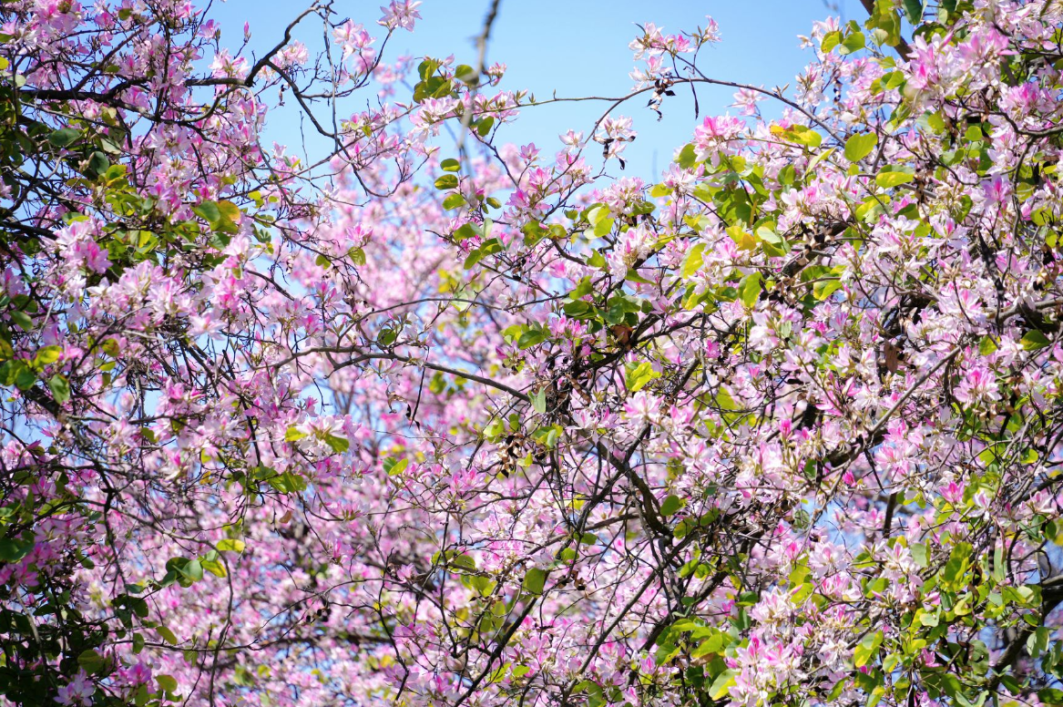 走在玉溪大河旁的步道上,粉紫色的紫荆花缀满枝头,层层叠叠,如云似霞。