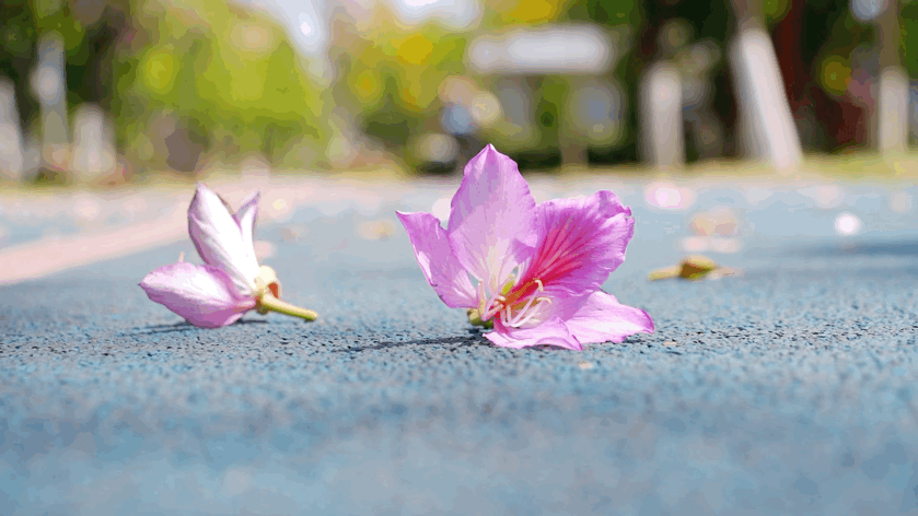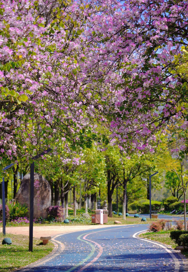 阳光穿过花枝,在步道上洒下细碎光斑,花瓣随风轻落,落在肩头、发梢,也落在每一个热爱生活的人心里。