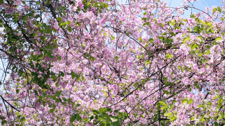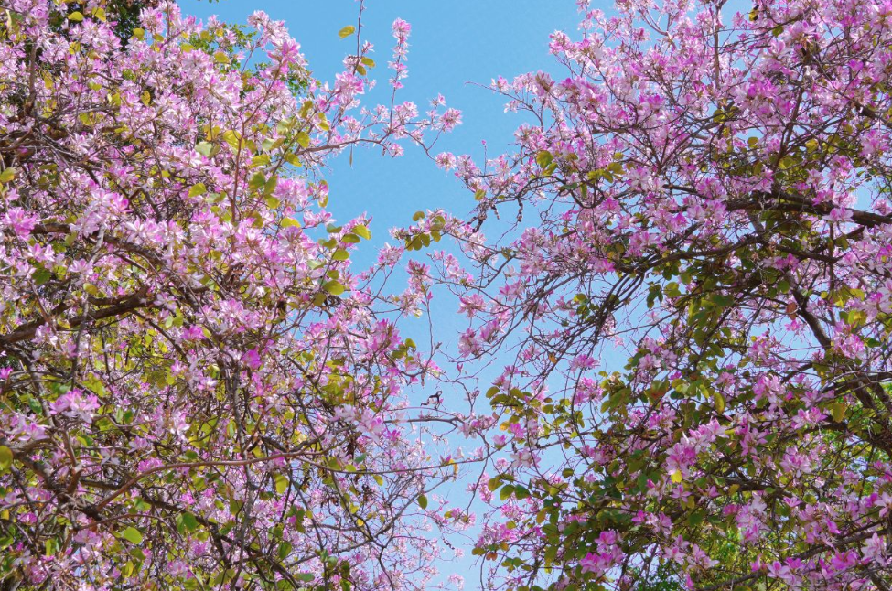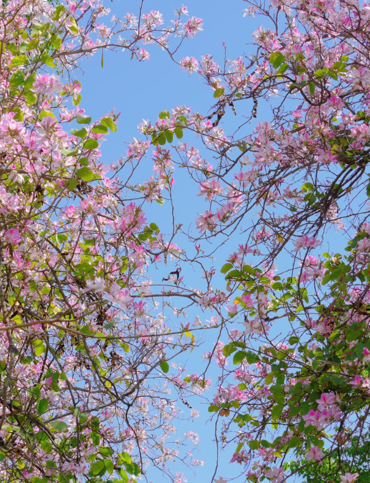 粉紫的热烈与洁白的清雅交织,在湛蓝天空的映衬下,勾勒出一幅绝美的春日画卷。