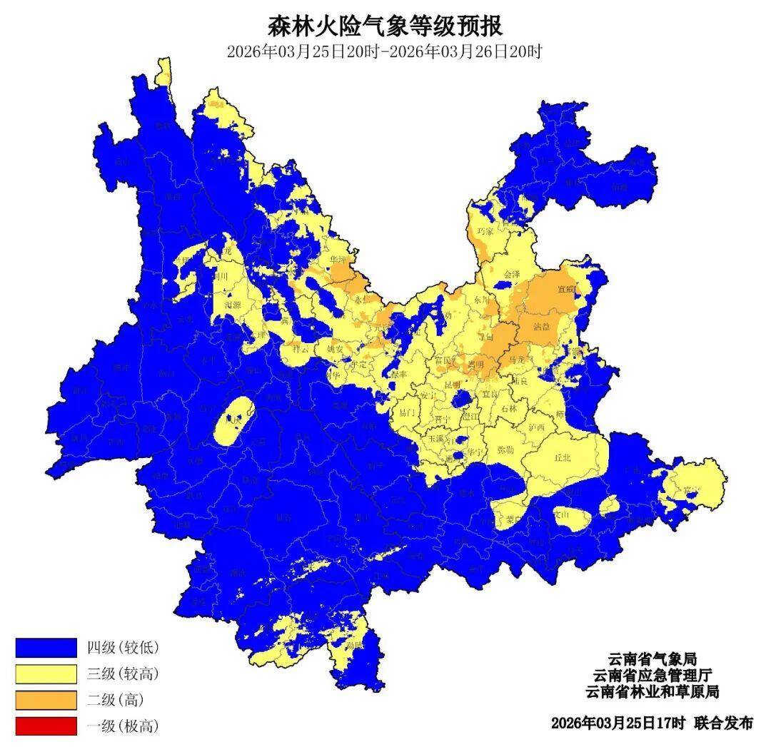 2026年3月25日20时至2026年3月26日20时,丽江市东南部、楚雄州北部、昆明市东部、昭通市西南部、曲靖市中部二级(高),迪庆州东部、丽江市东部、大理州北部和东部、临沧市西北部、西双版纳州中部、楚雄州中部和东部、昆明市大部、玉溪市北部和东部、昭通市南部、曲靖市北部和西南部、红河州北部、文山州西北部和东部三级(较高),其他地区四级(较低)。