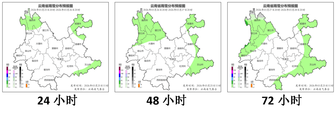 3月25日20时-26日20时:迪庆州北部、怒江州北部多云有阵雨,高海拔地区有阵雪,迪庆州南部、昭通市、曲靖市东北部、文山州南部、红河州东南部多云有分散阵雨,其他地区晴间多云。