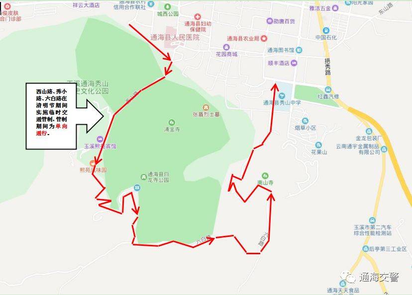 为确保2026年“清明节”期间道路交通安全畅通有序,通海县公安局将对秀山公园周边墓区重点道路祭扫高峰时段进行交通管制。具体内容如下 高峰时段预计为:4月4日、4月5日、4月6日(10:00至16:00) 管制路段:熙苑宾馆白龙寺小水沟南山寺六中将实行单向行驶 (具体管制路段请点击查看大图) 蜀黍提醒:清明节期间,请广大交通参与者自觉遵守交通法律法规,做到不超速、不超员,不强超强会、不在路口以及狭窄路段乱停车。如发生拥堵,请耐心等待,服从现场交警的指挥,有序停车,切勿穿插,有序通行。 通海县公安局 2026年3月29日 来源:通海警方
