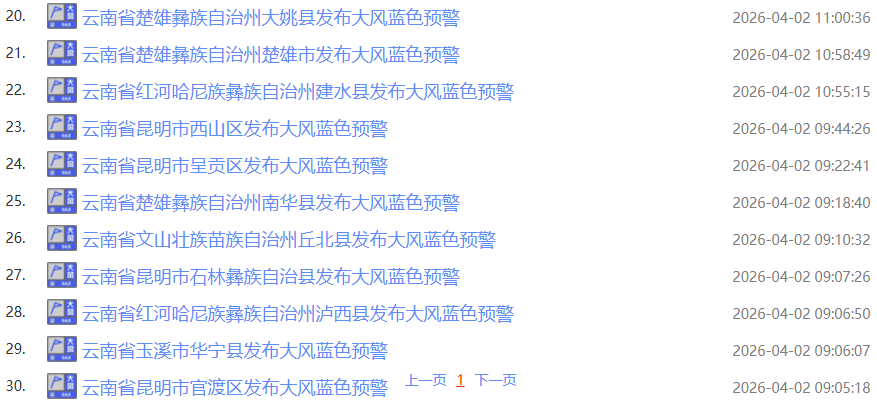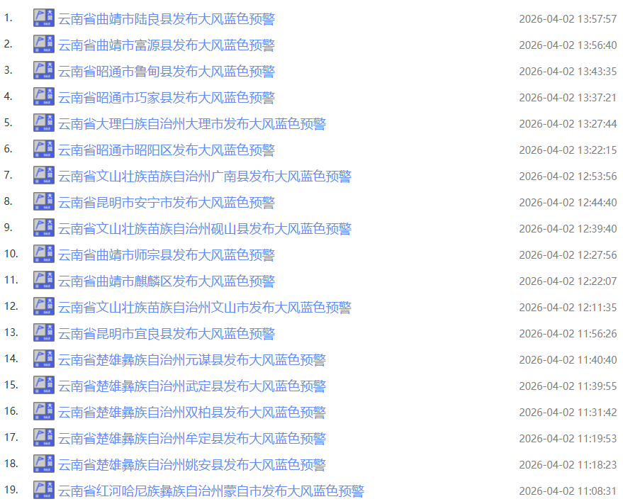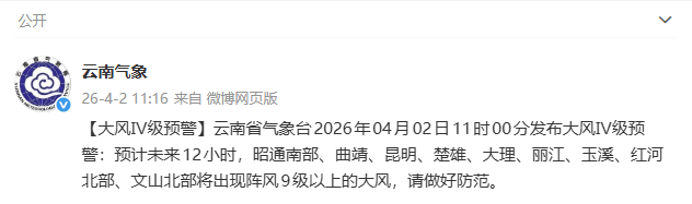 大风Ⅳ级预警 据云南省气象局官方微博@云南气象 消息,云南省气象台2026年04月02日11时00分发布大风Ⅳ级预警:预计未来12小时,昭通南部、曲靖、昆明、楚雄、大理、丽江、玉溪、红河北部、文山北部将出现阵风9级以上的大风,请做好防范。 防御指南: 1.政府及相关部门按照职责做好防大风工作; 2.停止露天活动和高空等户外危险作业,危险地带人员和危房居民尽量转到避风场所避风; 3.相关水域水上作业和过往船舶采取积极的应对措施,加固港口设施,防止船舶走锚、搁浅和碰撞; 4.切断户外危险电源,妥善安置易受大风影响的室外物品,遮盖建筑物资; 5.机场、高速公路等单位应当采取保障交通安全的措施,有关部门和单位注意森林、草原等防火。 4月2日20时到4月3日20时:迪庆州西部、怒江州、丽江市西部、大理州西部、保山市北部、德宏州北部、昭通市、曲靖市、昆明市东部、文山州、红河州北部多云间阴有阵雨局部中雨,其他地区晴间多云。 4月3日20时到4月4日20时:迪庆州、怒江州、丽江市西部、大理州西部、保山市、德宏州、昭通市、曲靖市、昆明市、楚雄州东部、玉溪市北部、文山州、红河州东部多云间阴有阵雨局部中雨,其他地区晴间多云。 4月4日20时到4月5日20时:迪庆州、怒江州、丽江市西部、大理州西部、保山市北部、德宏州北部、昭通市南部、曲靖市北部、昆明市北部多云间阴有阵雨局部中雨,其他地区晴间多云。 1.云南西北部、中东部午后局地有7到9级阵性大风。 2.云南东部、西部边缘有雷暴、局地短时强降水等强对流天气。 云南多地发布大风预警 阵风可达9级以上 风力强劲且风干物燥 火险等级较高 大风天气 防范这些潜在“风”险 这样应对