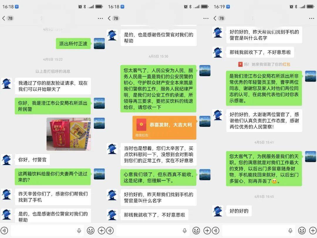 接过失而复得的手机,洪某感激之情溢于言表。于是夫妻二人到派出所附近的小卖部买了两箱饮料送到派出所,表达谢意。为不辜负洪某一家的心意,民警收下饮料,在说明工作纪律后,将饮料钱转给洪某。“澄江很好,我们下次还来。”洪某真诚地说道。