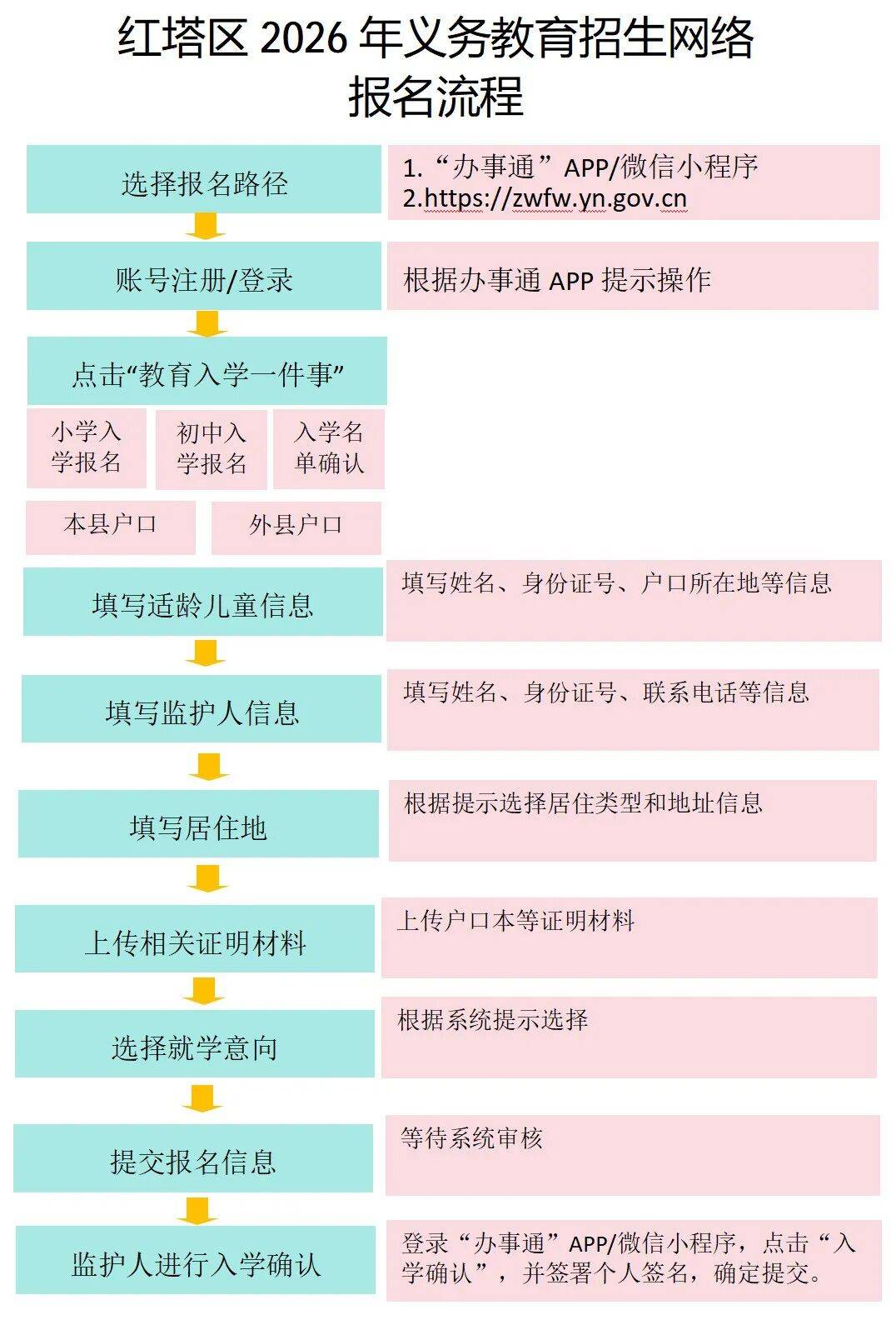 (一)系统信息登记:监护人通过手机下载【办事通APP】或使用电脑登录【云南政务服务网】注册后,点击“教育入学一件事”根据系统提示填写上传相关信息、材料。(信息采集时间以正式招生方案发布的时间为准)。