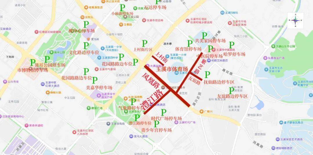 路边临时停车路段(停车区):场馆东侧的博爱路(聂耳路至凤凰路路段)、友谊路(环山路至抚仙路路段)、环山路可变停车区。仅限道路右侧单排停放,其他路段、路口禁止停车。