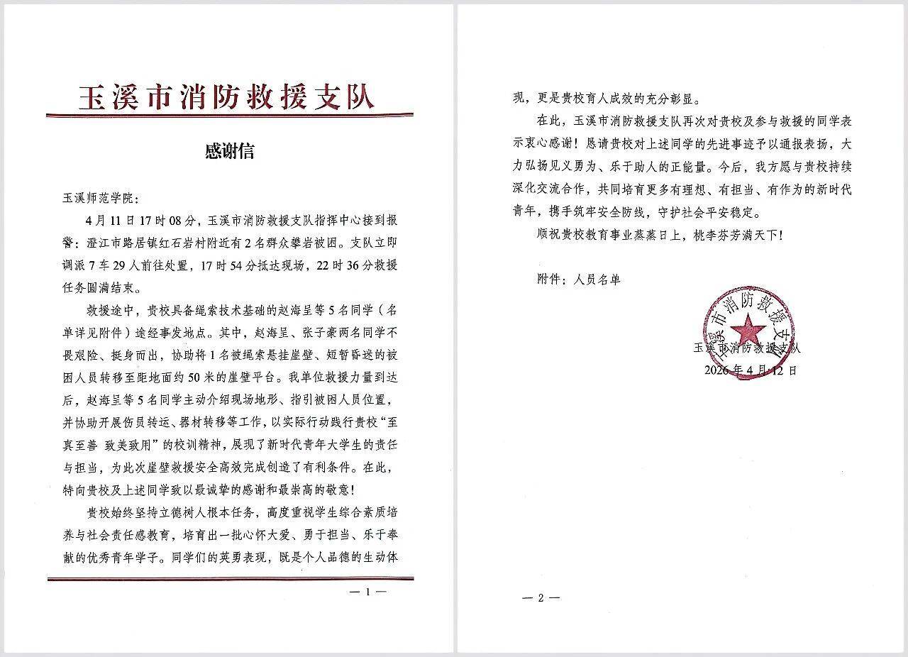 使命担当续新篇,携手共建谱华章。玉溪市消防救援支队在感谢信中希望学校对上述同学的先进事迹予以通报表扬,大力弘扬见义勇为、乐于助人的正能量,并表达了与学校持续深化交流合作、共同培育更多有理想、有担当、有作为的新时代青年的美好愿景。此次崖壁救援,不仅是玉师学子个人品德的生动体现,更是学校育人成效的具体彰显。玉溪师范学院将继续深化校地合作,充分发挥专业优势,与玉溪市消防救援支队等单位携手筑牢安全防线,共同守护社会平安稳定,在服务地方经济社会发展中展现更大作为。