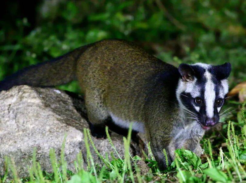果子狸(Paguma larvata),又名花面狸,是灵猫科,花面狸属的唯一物种,体长60cm左右,尾长约50cm,体重4-9公斤,面部有一道自鼻端至头后的白色纵纹,面颊也有白色的斑纹,故而得名花面狸。果子狸头部至肩部毛色为灰黑色,背部毛灰黄色,腹部毛色为浅灰色,四肢较短,毛色为暗褐色,尾尖黑色。