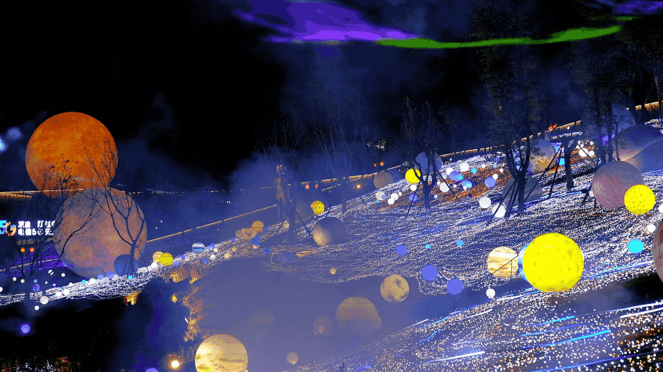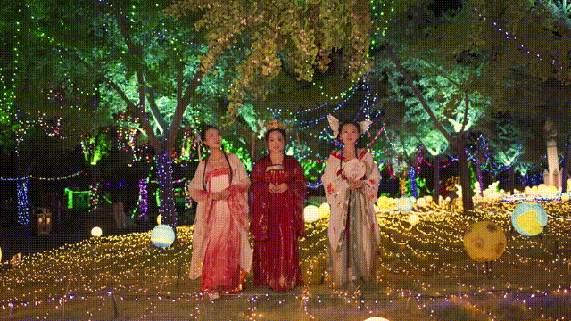 夜色氤氲,华灯璀璨,随处可见雅致汉服身影,氛围感拉满。万千玫瑰灯火次第盛放,流光漫染山野,沉浸式闯入梦幻花海秘境。