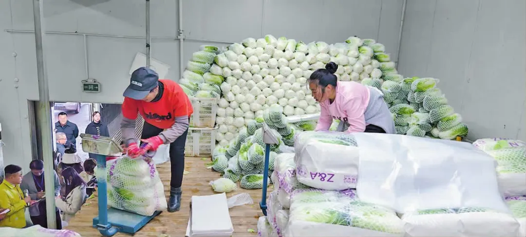 2024年12月1日,在通海万合进出口有限公司冷库内,工人忙着打包大白菜,将通过中老铁路运往老挝、泰国。(玉溪市融媒体中心资料图)